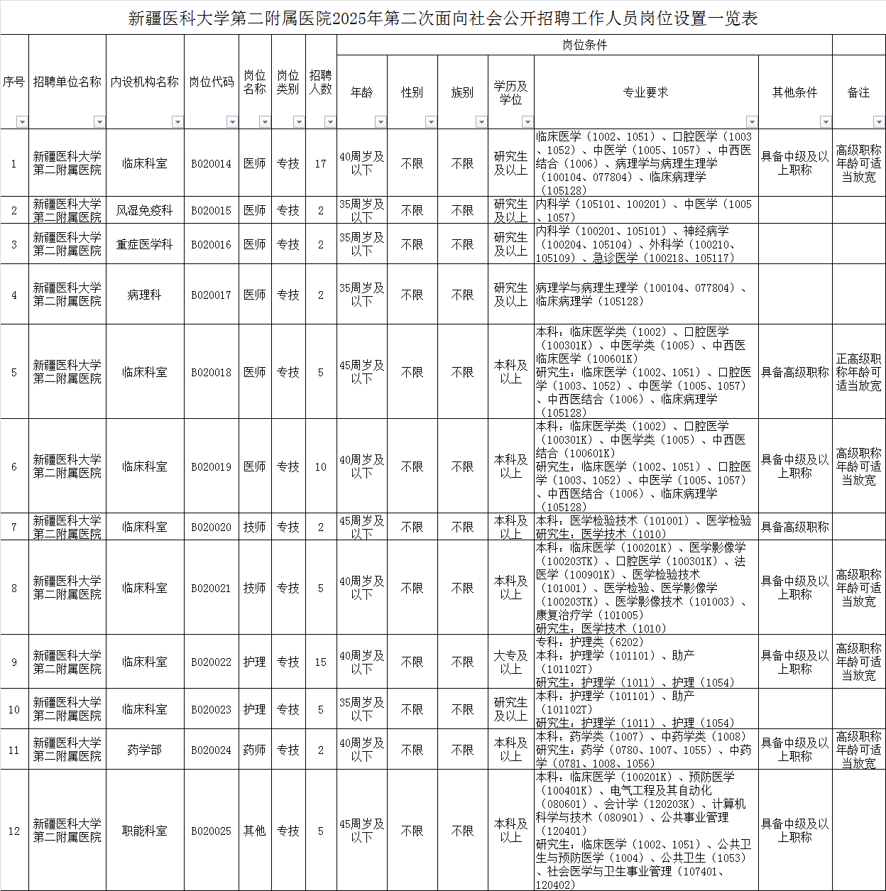 面向社会公开招聘,符合岗位条件的应聘人员均可报名应聘。具体岗位条件详见《新疆医科大学第二附属医院2025年第二次面向社会公开招聘工作人员岗位设置一览表》(附件1)。